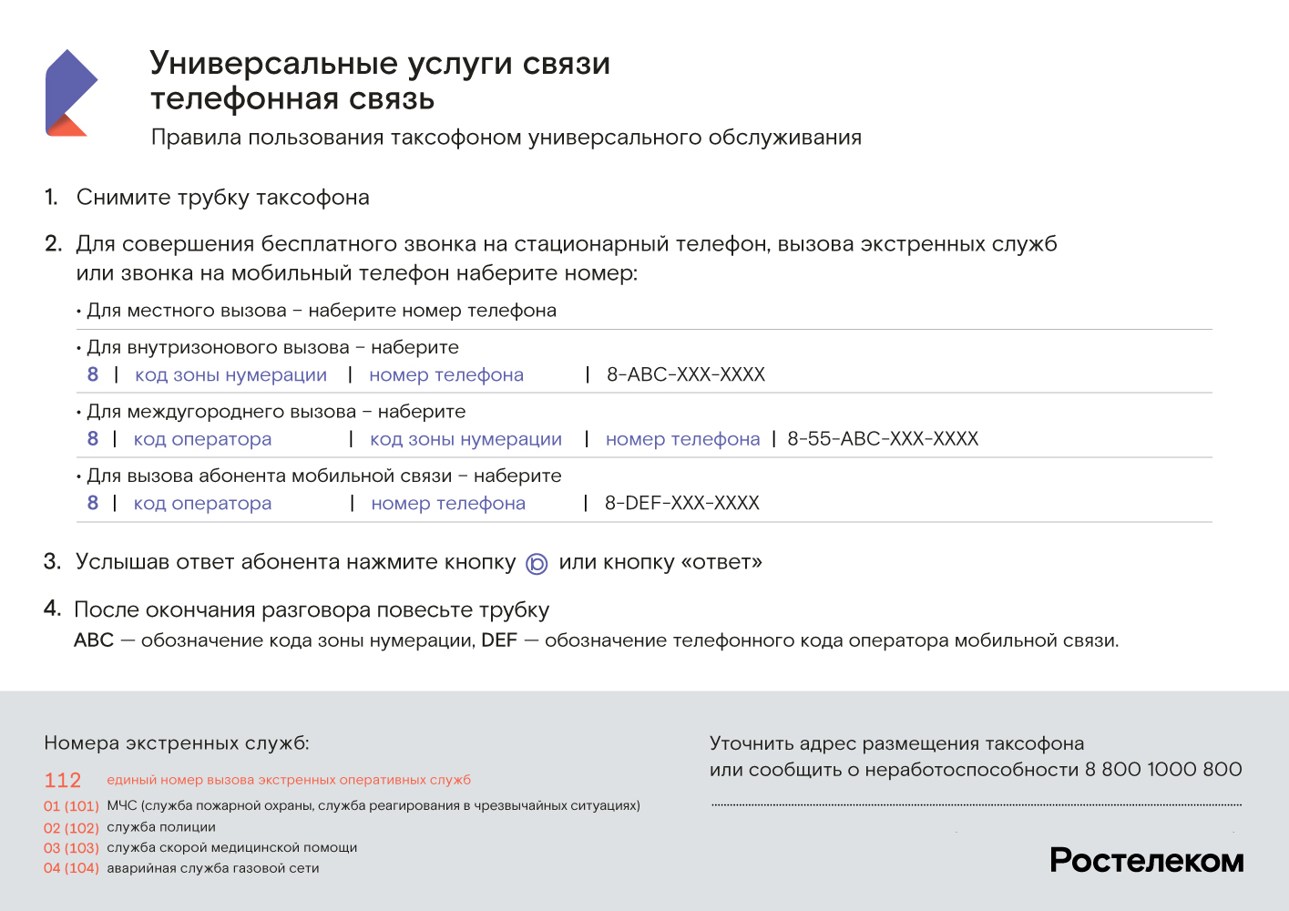В рамках повышения доступности универсальных услуг связи, с 15 ноября 2019 г. ПАО "Ростелеком" отменило плату за телефонные звонки на все номера мобильных телефонов российской Федерации с таксофонов универсальных услуг связи.