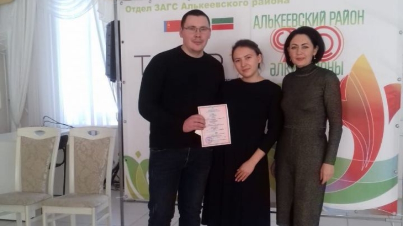 Заведующая отделом Энже Халиуллина вручила Айнуру Сафину и Лейсан Шараповой свидетельство о бракосочетаний- первый документ их семьи.