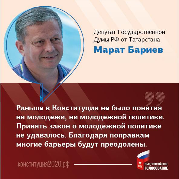Поправка депутата Государственной Думы РФ от Татарстана Марата Бариева о молодежной политике прошла в окончательном варианте поправок к Конституции.