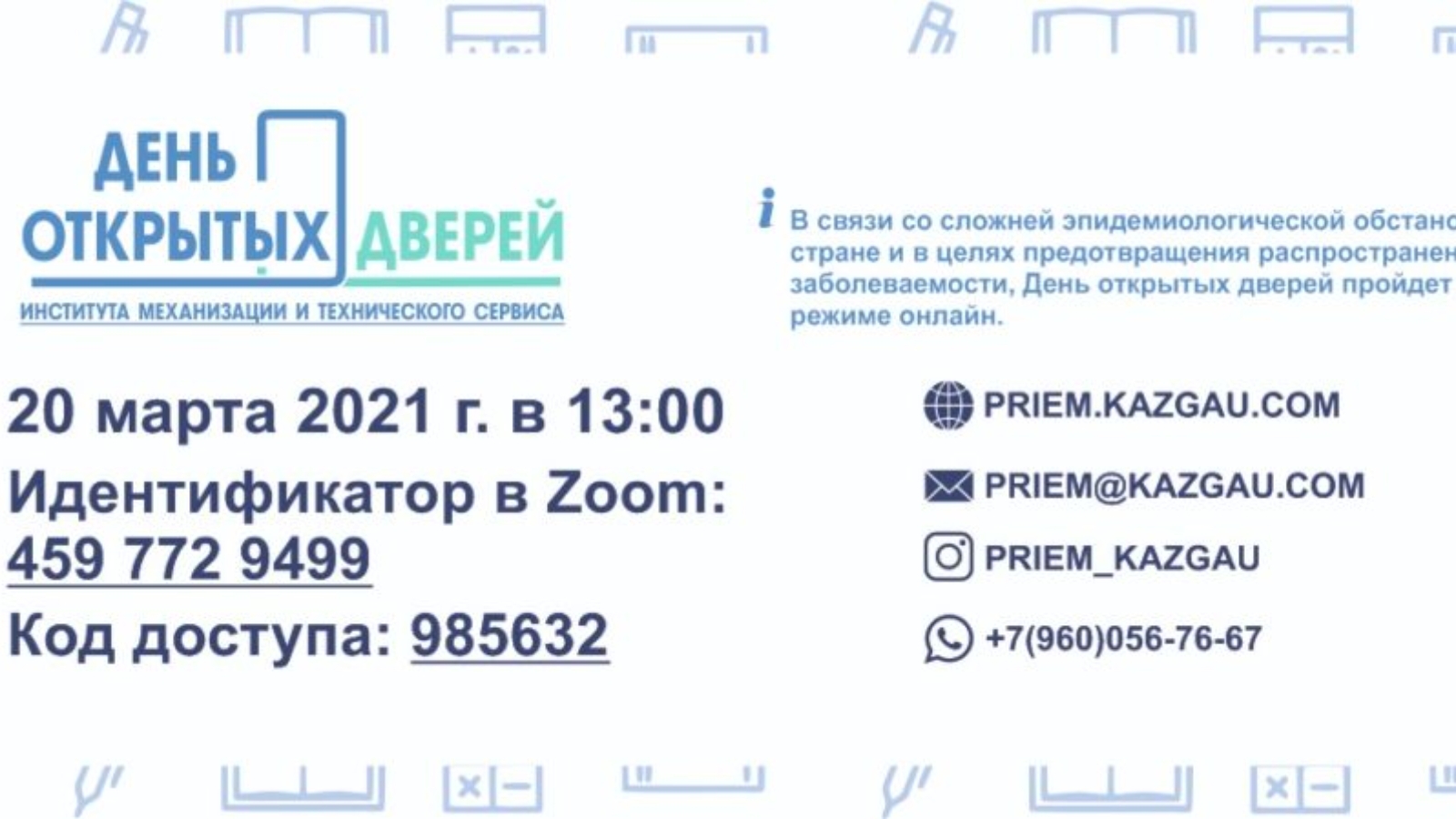 За более подробной информацией о дне открытых дверей можно обратиться в Приемную комиссию или в Центр довузовского образования Казанского ГАУ по телефонам 8(843) 236-66-71, 567-46-30, 8-960-056-76-67 (подключен WhatsApp), а также по электронной почте priem@kazgau.com или сайту www.priem.kazgau .