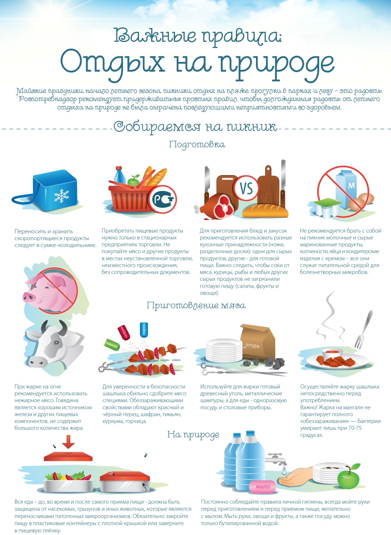 В преддверие майских праздников Территориальный отдел Управления Роспотребнадзора по Республике Татарстан (Татарстан) в Нурлатском, Аксубаевском, Алькеевском, Черемшанском районах в целях сохранения здоровья рекомендует ознакомиться с правилами отдыха на природе и рекомендациями, предупреждающими пищевые отравления.