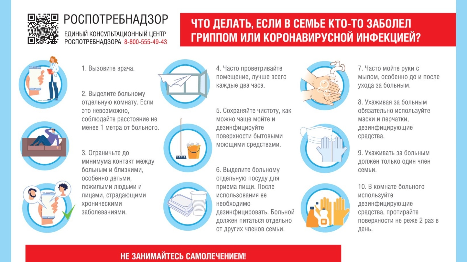 10. В комнате больного используйте дезинфицирующие средства, протирайте поверхности не реже 2 раз в день.