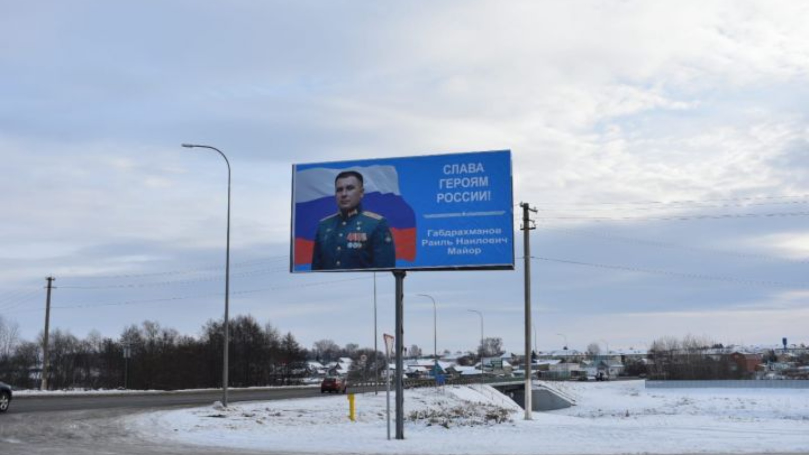 В Базарных Матаках установлен большой баннер, на котором напечатаны слова «Слава Героям России! Габдрахманов Раиль Наильевич "Майор" с фотографией нашего земляка в военной форме на фоне государственного флага Российской Федерации.