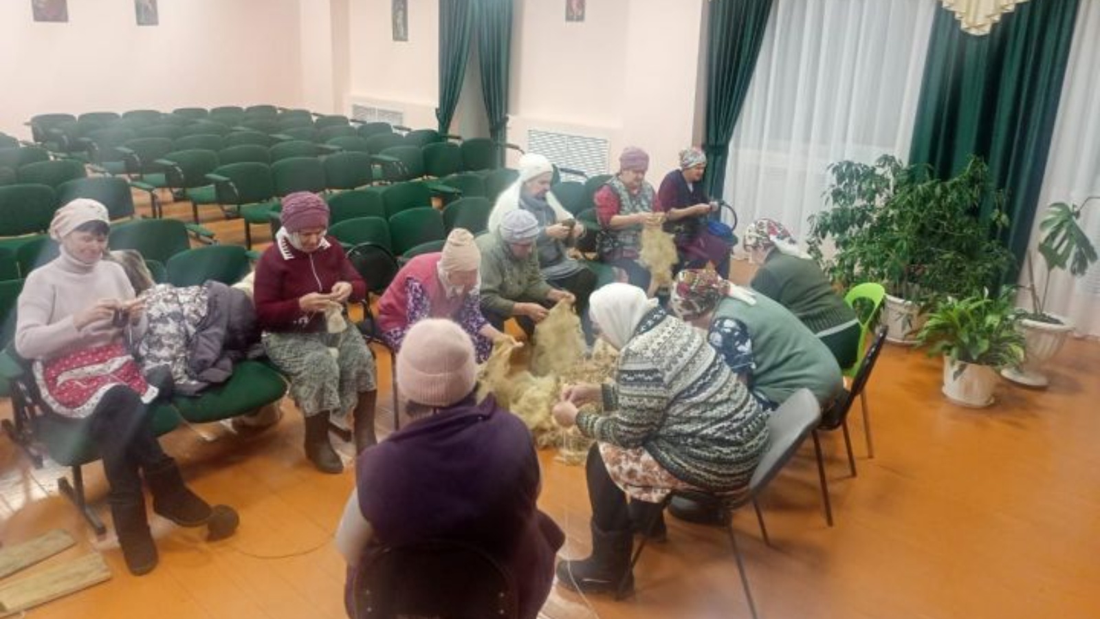 Этим добрым делом заняты женщины, собирающиеся по вечерам в местном клубе: одни –очищают, другие – прядут шерсть для будущих носков. Помогать им взялись и активные девушки.
