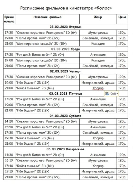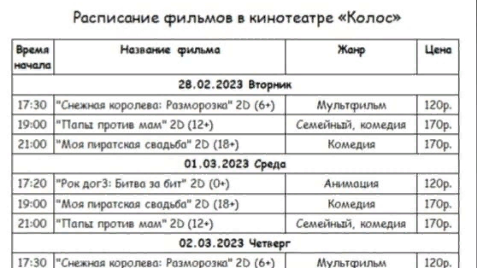 Расписание фильмов в кинотеатре "Колос"