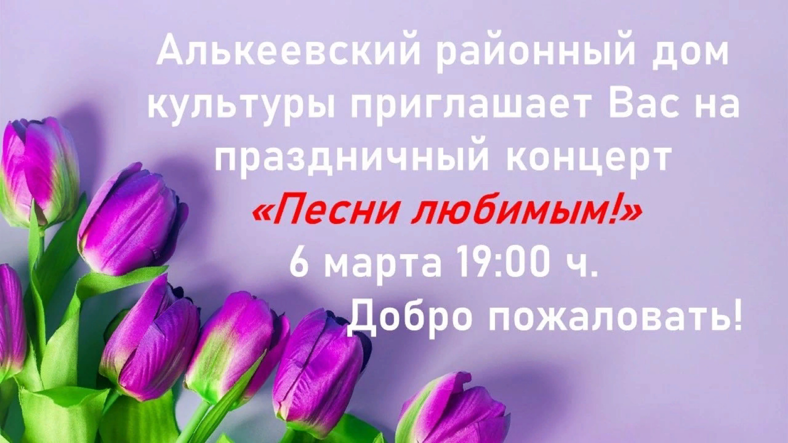 Алькеевский районный дом культуры приглашает Вас на праздничный концерт «Песни любимым!» 6 марта 19:00 ч.