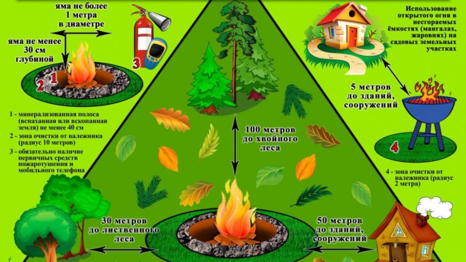 -место использования открытого огня должно располагаться на расстоянии не менее 50 метров от ближайшего объекта (здания, сооружения, постройки, открытого склада, скирды), 100 метров - от хвойного леса или отдельно растущих хвойных деревьев и молодняка и 30 метров - от лиственного леса или отдельно растущих групп лиственных деревьев;