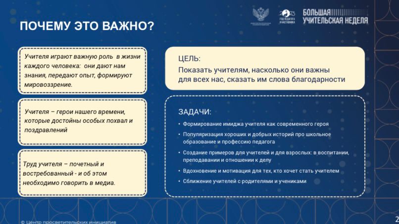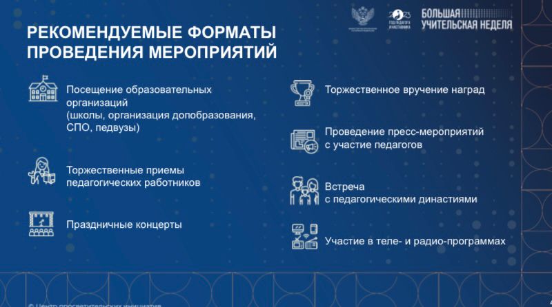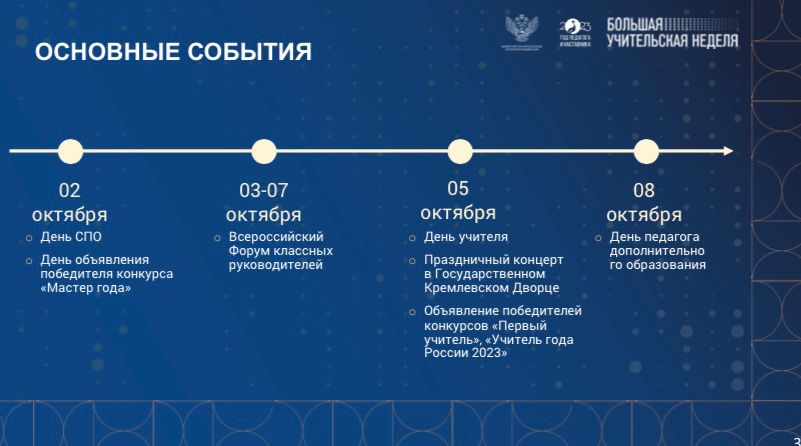 Знаковыми событиями Большой учительской недели федерального уровня станут III Форум классных руководителей и наставников, торжественные мероприятия, посвященные Дню среднего профессионального образования, праздничный концерт в Государственном Кремлевском Дворце, посвящённый Дню учителя, подведение итогов ключевых Всероссийских конкурсов.