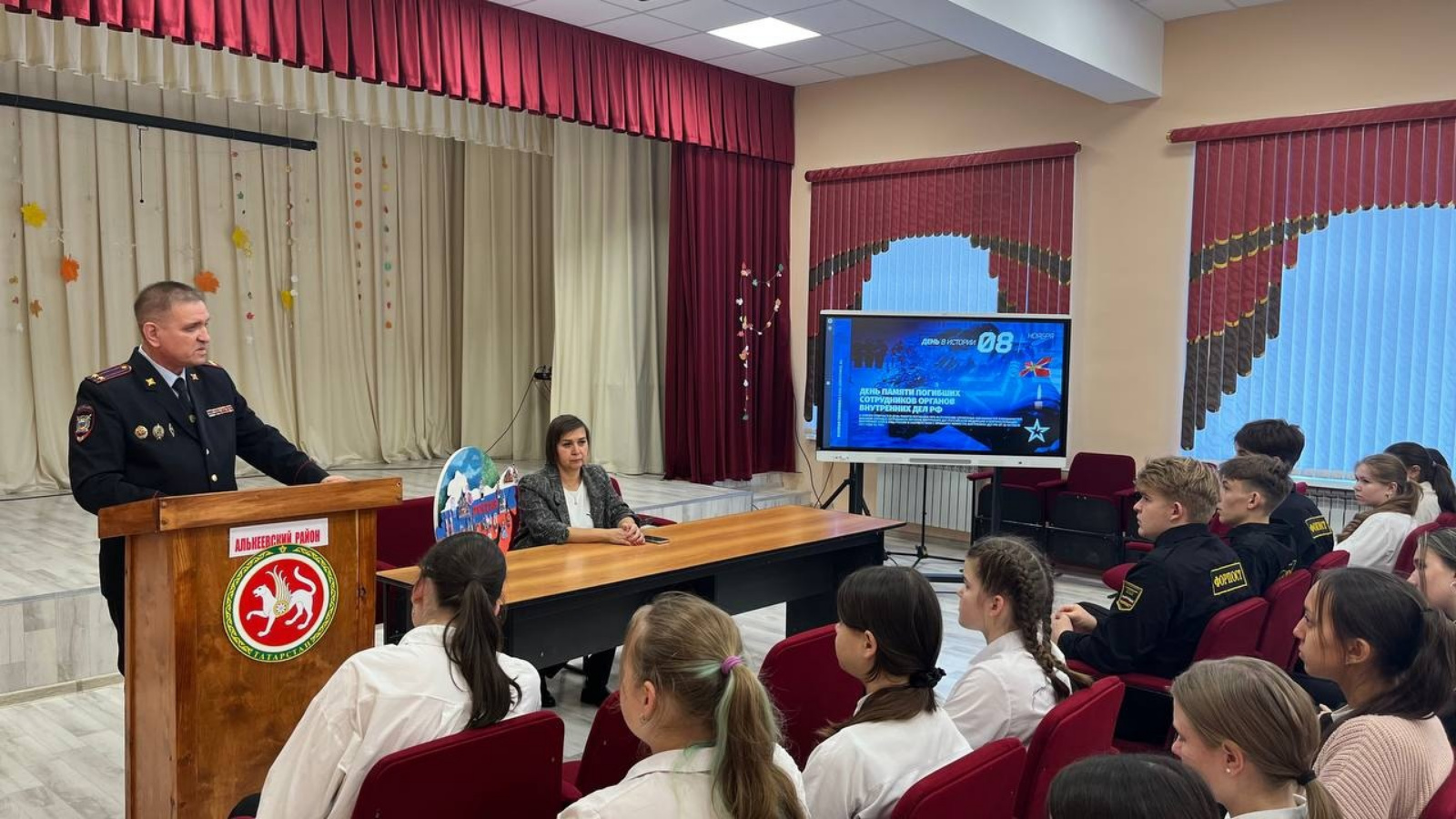 08 ноября 2023 года советник директора по воспитанию МБОУ "Базарно-Матакская СОШ" Алькеевского района Кимаева Е.В. совместно с активом школы провели мероприятие «На страже Родины моей». На которое были приглашены подполковник полиции Гайфуллин Равиль Наилович и Сагитова Гульнур Юсуповна муниципальный куратор советников директоров по воспитанию.