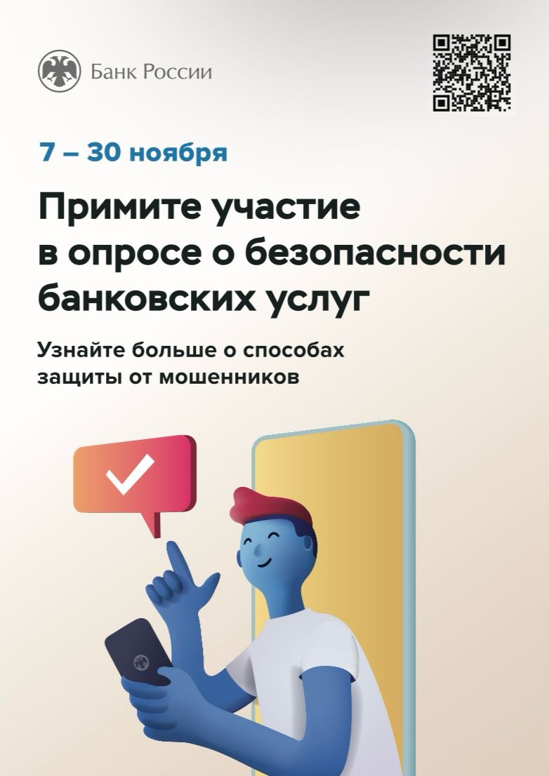 Прохождение анкетирования (для физических и юридических лиц) возможно по прилагаемому к письму QR-коду. Настоящий опрос будет проводиться в период с 07.11.2023 по 30.11.2023 посредством заполнения соответствующих обезличенных опросных форм, размещенных на официальном сайте Банка России. Пройти опрос можно по указанным ниже ссылке на интернет-ресурс или QR-коду.