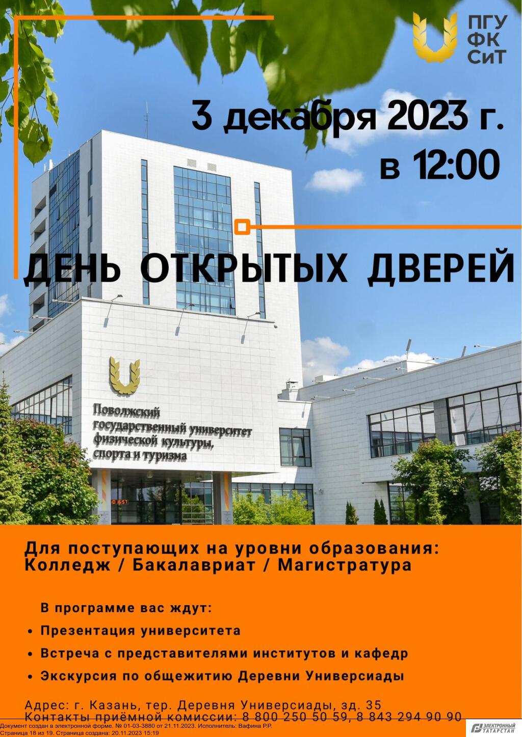 Дополнительно сообщаем, что 3 декабря 2023 года в 12:00 часов Университет проводит День открытых дверей. Мероприятие пройдет в Учебно-лабораторном корпусе по адресу: г. Казань, тер. Деревня Универсиады, зд. 35. В программе мероприятия: презентация Университета, встреча с представителями институтов, кафедр и приемной комиссии, экскурсия в студенческое общежитие.