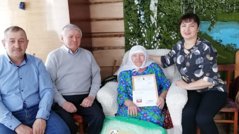 Әбигә Россия Президенты В. В. Путинның котлау хаты, район башлыгы А. Ф. Никошинның котлау хаты һәм истәлекле бүләк тапшырылды. Нык сәламәтлек һәм иминлек теләделәр.