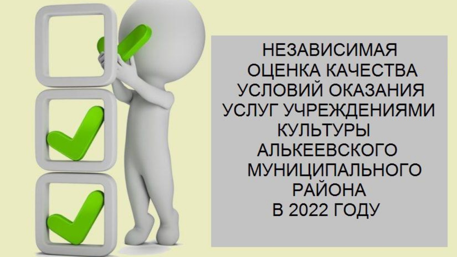 Әлки муниципаль районы Иҗтимагый советының хезмәт күрсәтү шартларын бәйсез бәяләү буенча узган утырышында 2022 елда Әлки муниципаль районының мәдәният учреждениеләрендә хезмәт күрсәтү сыйфатын бәйсез бәяләү уздыру планы-графигы кабул ителде һәм расланды.