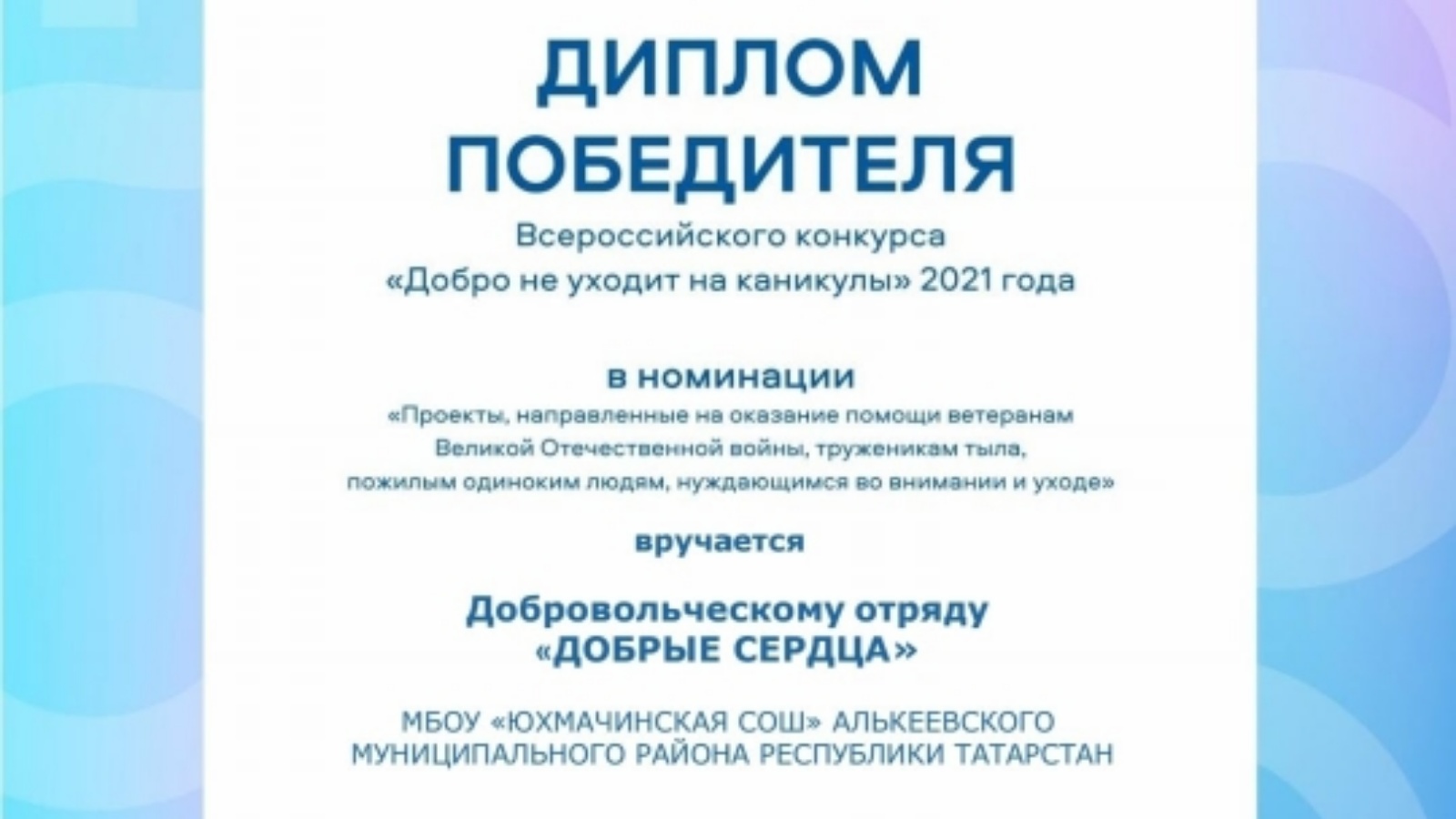 “Юхмачы урта гомуми белем бирү мәктәбе” МБББУнең "Игелекле йөрәкләр" волонтерлар отряды "Яхшылык каникулга китми" дип исемләнгән Бөтенроссия конкурсында җиңүче булды.Бөек Ватан сугышы ветераннарына, тыл хезмәтчәннәренә, өлкән яшьтәгеләргә, игътибар һәм тәрбиягә мохтаҗларга ярдәм күрсәтүгә юнәлдерелгән конкурс номинациясендәге социаль проектлар. Отряд җитәкчесе Гыймадиева Зөлфия Насыйбулла кызы, педагог-оештыручы