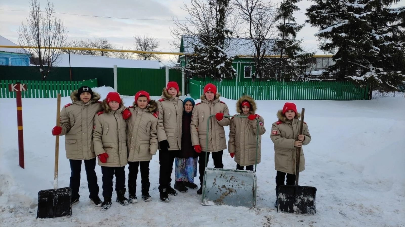 Нәби Даули исемендәге Базарлы Матак гимназиясенең яшьармияче отряды үзенең шефка бирелгән ветераны Сәгъдиева Дания Нургат кызына, территорияне кардан чистартып, тылсымлы ярдәм күрсәтә.