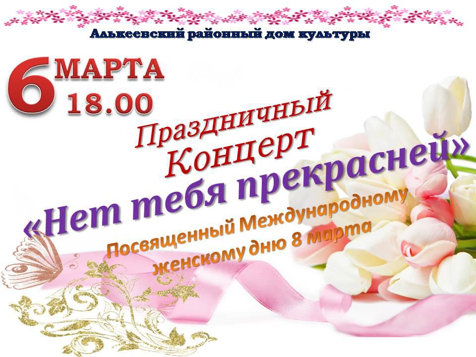 Әлки районында мәдәният йортында 6 март көнне 18:00 сәгатьтә 8 Март Халыкара хатын-кызлар көненә багышланган "Синнән дә матуррак юк"дигән бәйрәм концерты узачак.