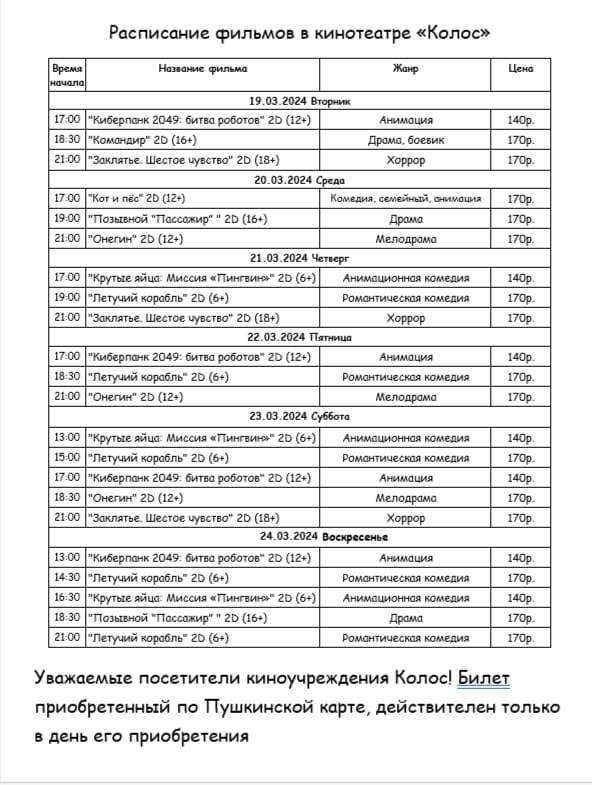 "Колос" кинотеатрында фильмнар җәдвәле